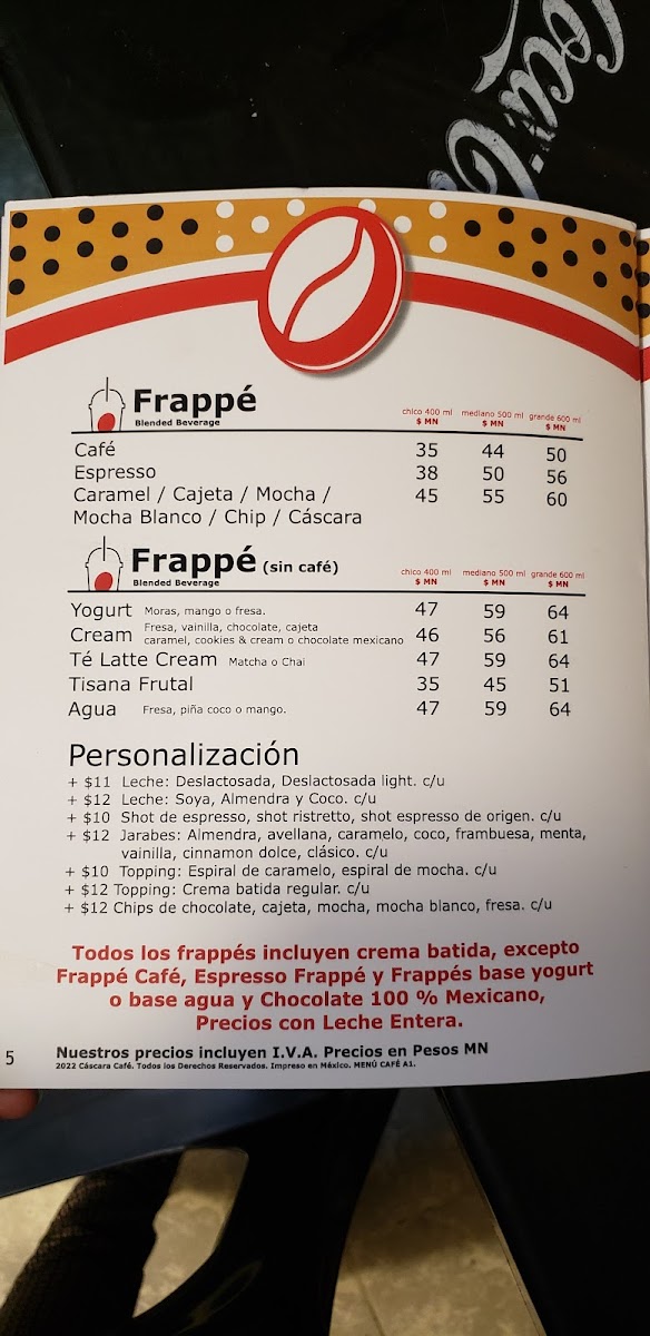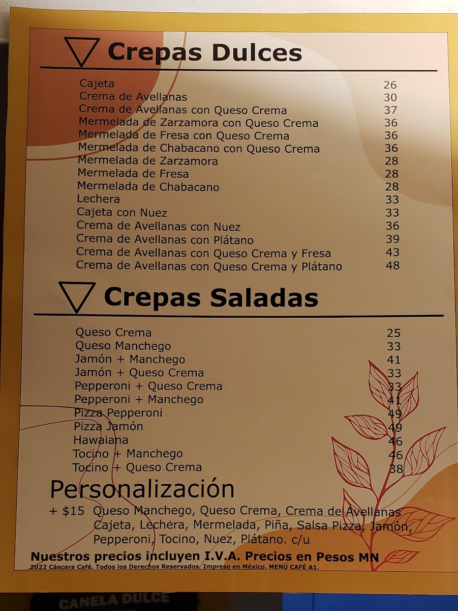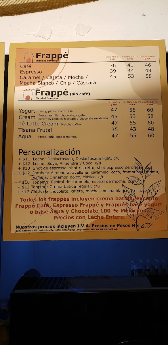 Welcome to Cáscara Café, a hidden gem nestled in Heroica Puebla de Zaragoza. This charming little cafeteria offers a delightful menu that caters to various tastes. Their frappés, such as the Frappé de Té Verde and Hibiscus Frutal Frappé, provide a refreshing twist, perfect for a warm day. For something more indulgent, try the Crepa Especial De Chocolate, laden with rich toppings like Ferrero Rocher and strawberries.